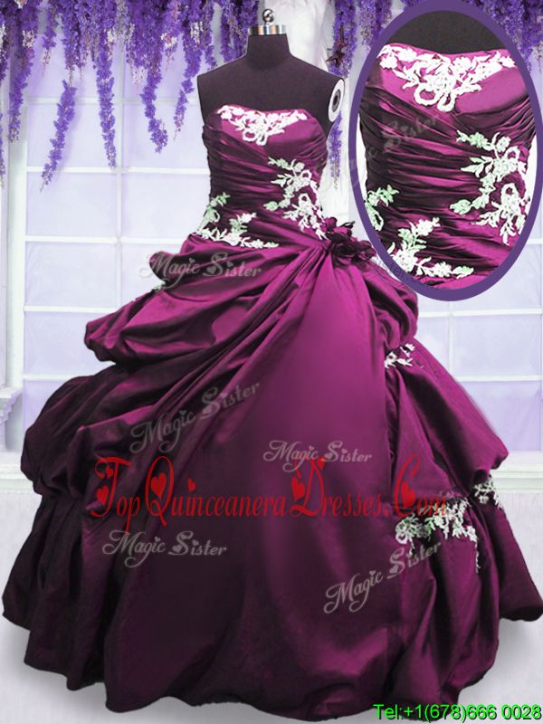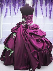 High Class Purple Ball Gowns Strapless Sleeveless Taffeta Floor Length Lace Up Appliques and Pick Ups 15th Birthday Dress