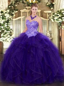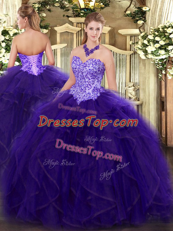 High Class Purple Lace Up Sweetheart Appliques and Ruffles Sweet 16 Dress Organza Sleeveless