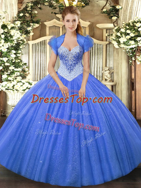 High Class Sweetheart Sleeveless Sweet 16 Dresses Floor Length Beading Blue Tulle