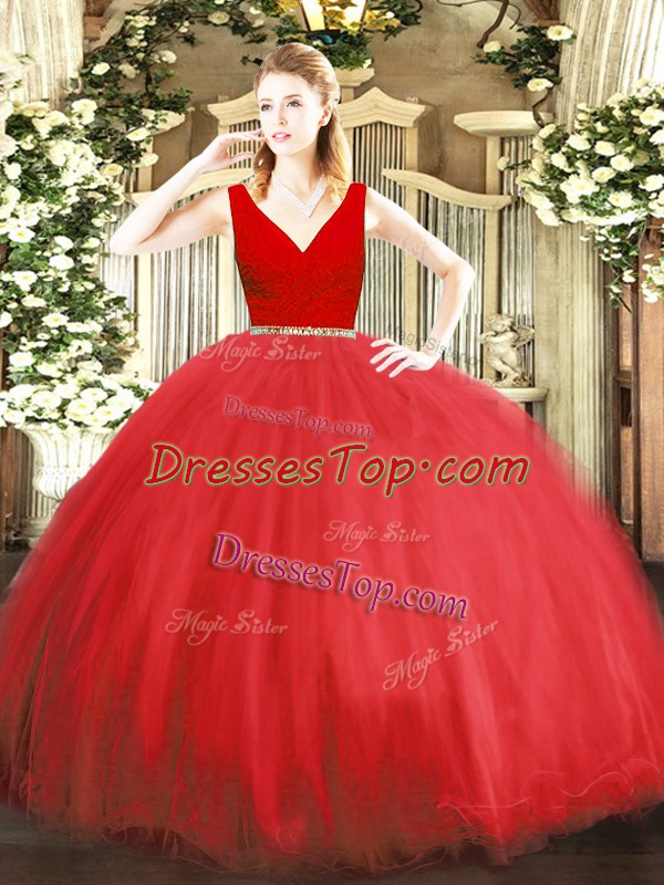 High Class Tulle V-neck Sleeveless Zipper Beading Quince Ball Gowns in Red