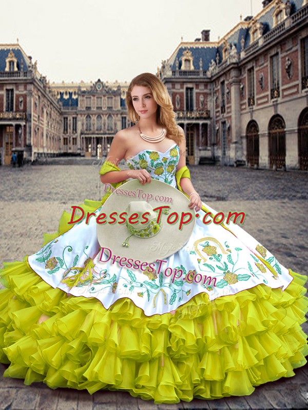 High Class Yellow Green Lace Up Ball Gown Prom Dress Embroidery and Ruffled Layers Sleeveless Floor Length