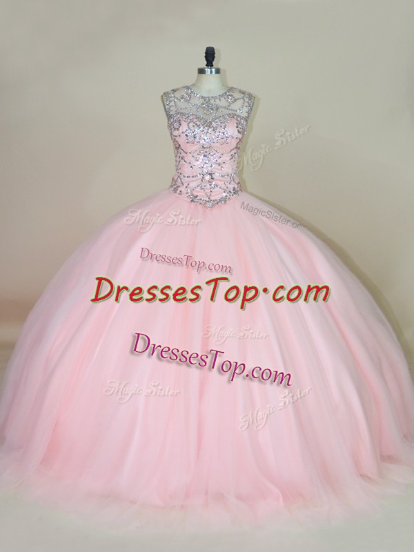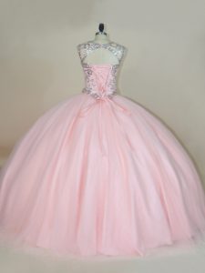 High End Baby Pink Ball Gowns Tulle Scoop Sleeveless Beading Lace Up Ball Gown Prom Dress