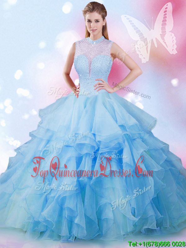 High End Ball Gowns Quinceanera Gowns Baby Blue High-neck Tulle Sleeveless Floor Length Lace Up