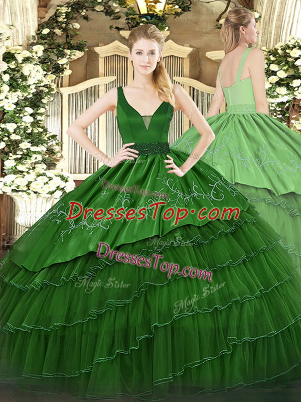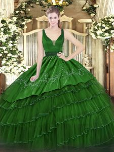 High End Dark Green Ball Gowns Organza and Taffeta Straps Sleeveless Beading and Embroidery and Ruffled Layers Floor Length Zipper 15th Birthday Dress