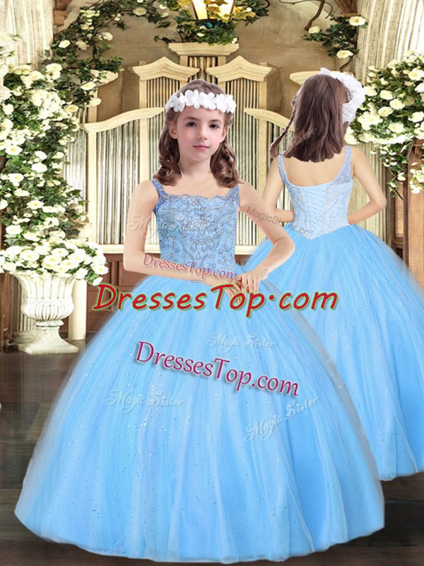 High End Floor Length Lace Up Kids Pageant Dress Baby Blue for Party and Sweet 16 and Quinceanera and Wedding Party with Beading