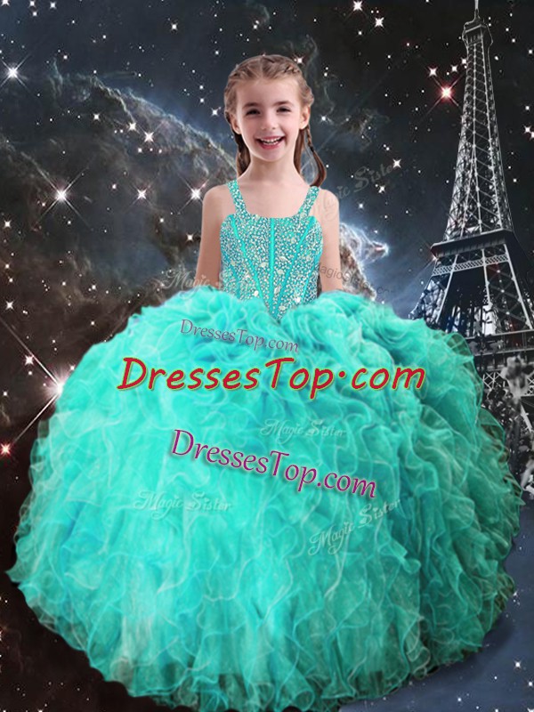High End Floor Length Lace Up Kids Pageant Dress Turquoise for Quinceanera and Wedding Party with Beading and Ruffles