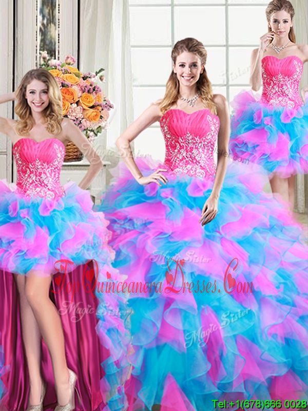 High End Four Piece Apple Green Lace Up Quinceanera Dress Beading and Ruffles and Pick Ups Sleeveless Floor Length