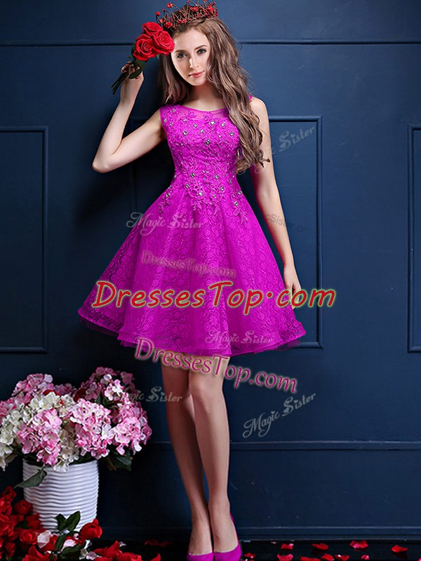 High End Fuchsia Tulle Lace Up Quinceanera Dama Dress Sleeveless Knee Length Beading and Lace