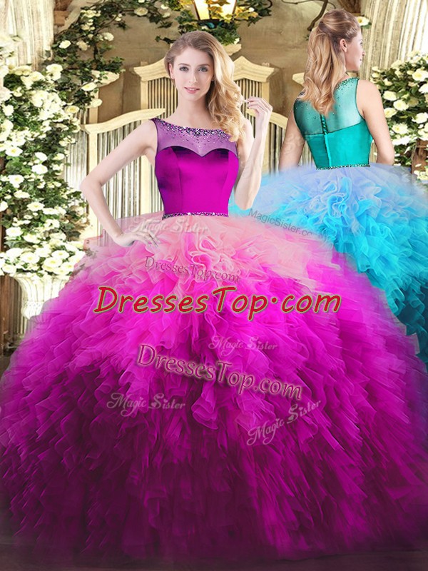 High End Fuchsia Tulle Zipper Quince Ball Gowns Sleeveless Floor Length Beading and Ruffles