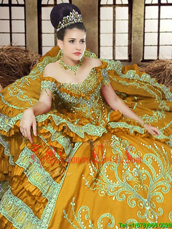High End Off the Shoulder Gold Sleeveless Satin Lace Up Dama Dress for Military Ball and Sweet 16 and Quinceanera