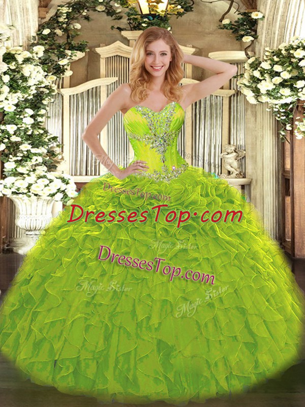 High End Olive Green Organza Lace Up Quinceanera Gowns Sleeveless Floor Length Beading and Ruffles