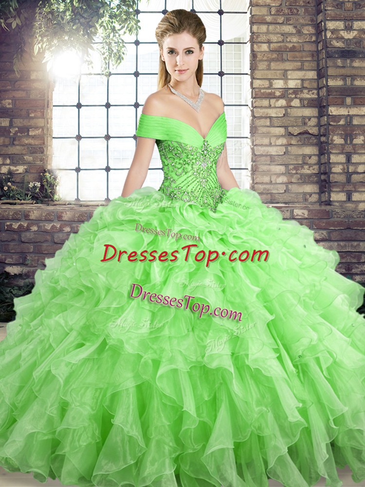 High End Organza Off The Shoulder Sleeveless Brush Train Lace Up Beading and Ruffles 15th Birthday Dress in