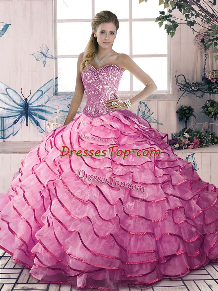 High End Pink Quinceanera Dresses Sweet 16 with Beading and Ruffles Sweetheart Sleeveless Lace Up