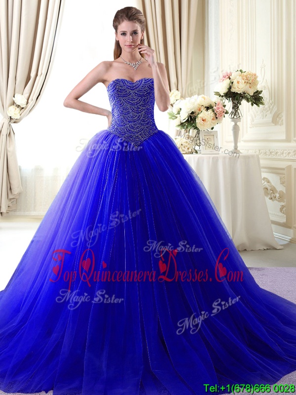 High End Sweetheart Sleeveless Brush Train Lace Up Ball Gown Prom Dress Royal Blue Tulle