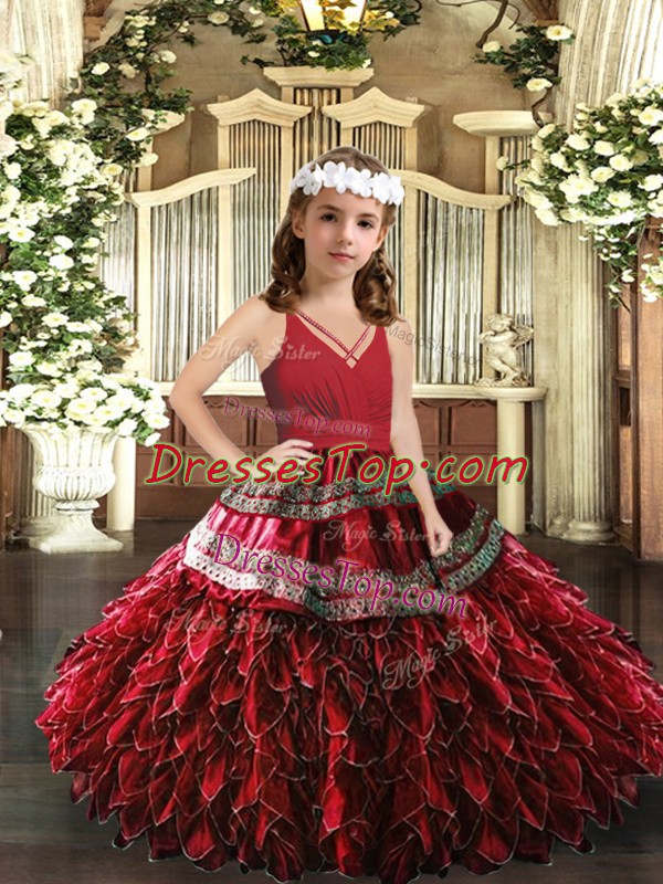 High End V-neck Sleeveless Zipper Custom Made Pageant Dress Red Organza