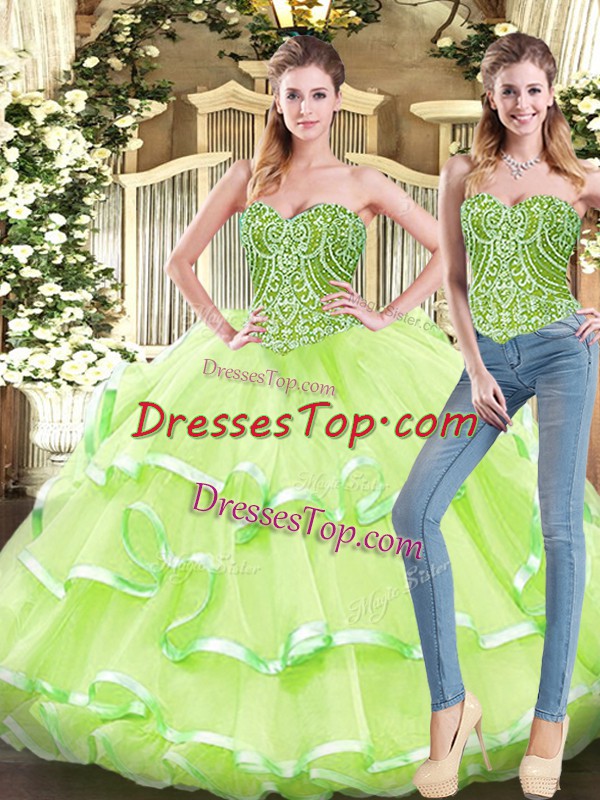High End Yellow Green Quinceanera Gowns Military Ball and Sweet 16 and Quinceanera with Beading and Ruffled Layers Sweetheart Sleeveless Lace Up