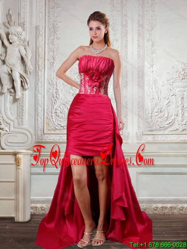 High Low Strapless Coral Red Quinceanera Dama Dresses with Hand Made Flower and Ruffles