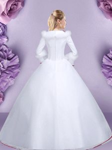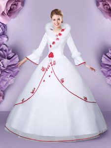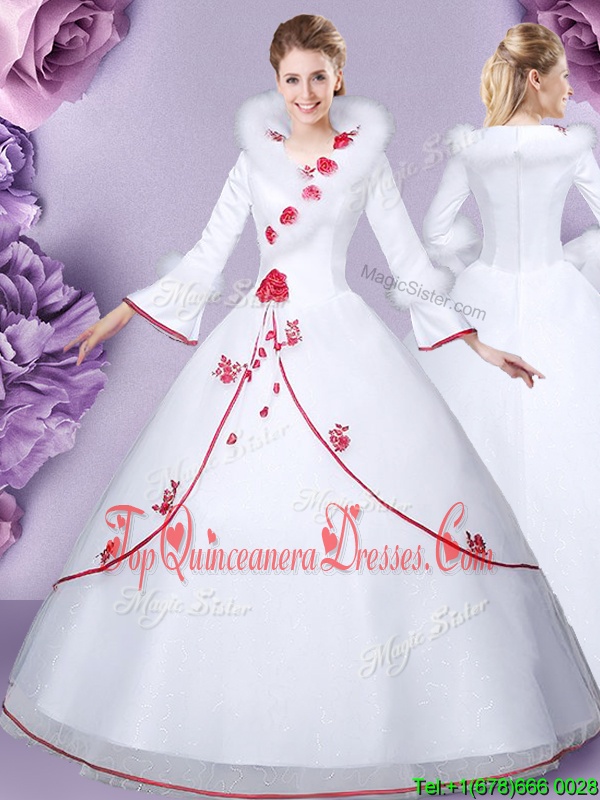 High-neck Long Sleeves Quinceanera Gown Floor Length Embroidery and Hand Made Flower White Tulle and Lace