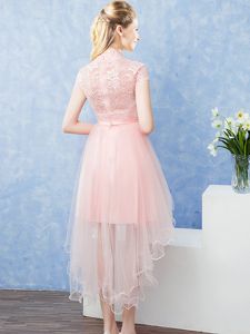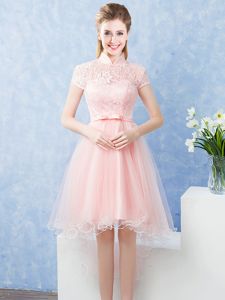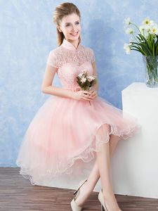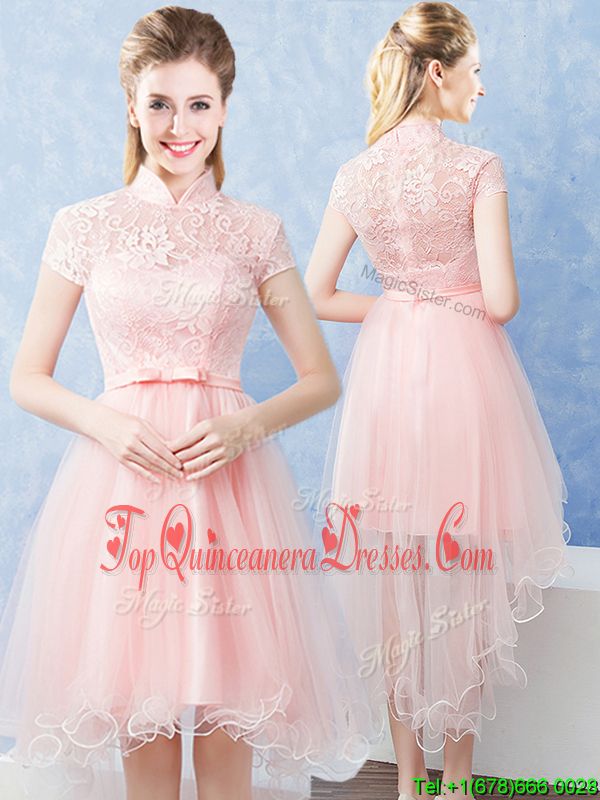 High-neck Short Sleeves Dama Dress for Quinceanera High Low Lace and Belt Baby Pink Tulle