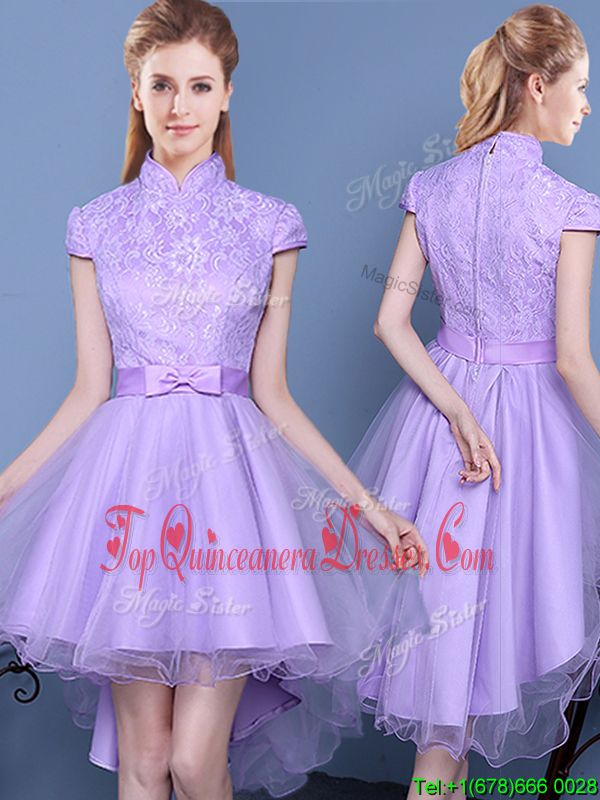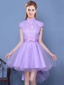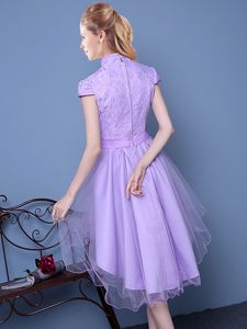 High-neck Short Sleeves Zipper Quinceanera Dama Dress Lavender Tulle