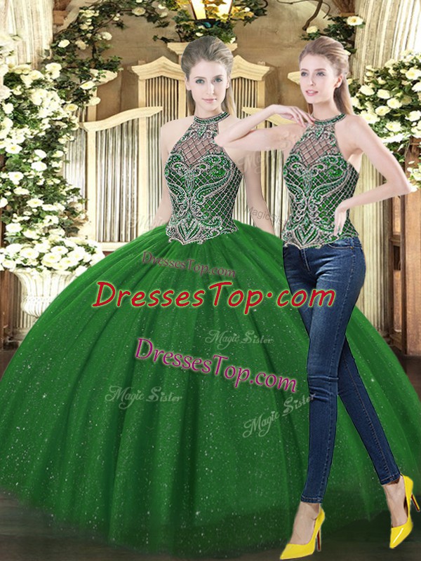 High-neck Sleeveless Lace Up 15 Quinceanera Dress Dark Green Tulle