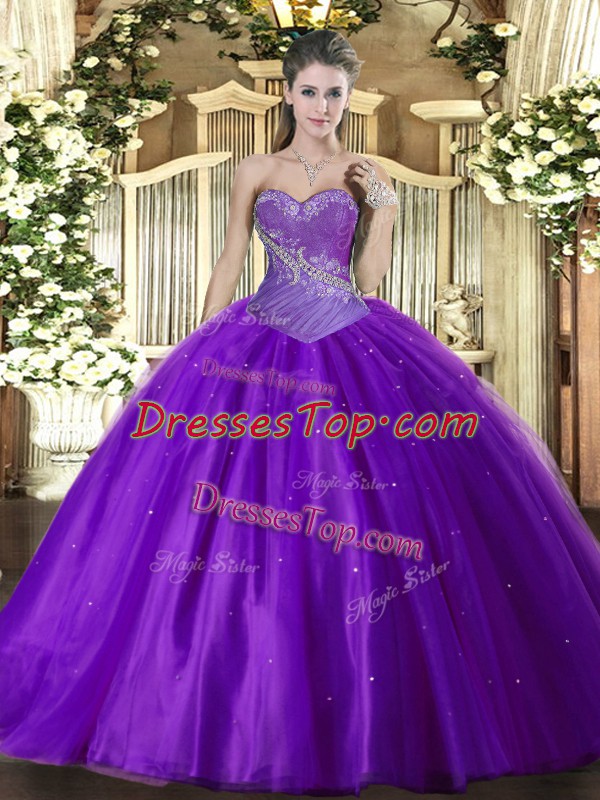 High Quality Eggplant Purple Ball Gowns Sweetheart Sleeveless Tulle Floor Length Lace Up Beading Vestidos de Quinceanera