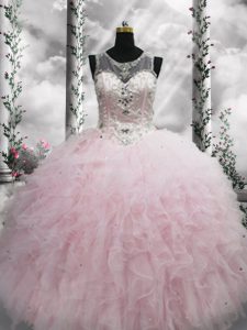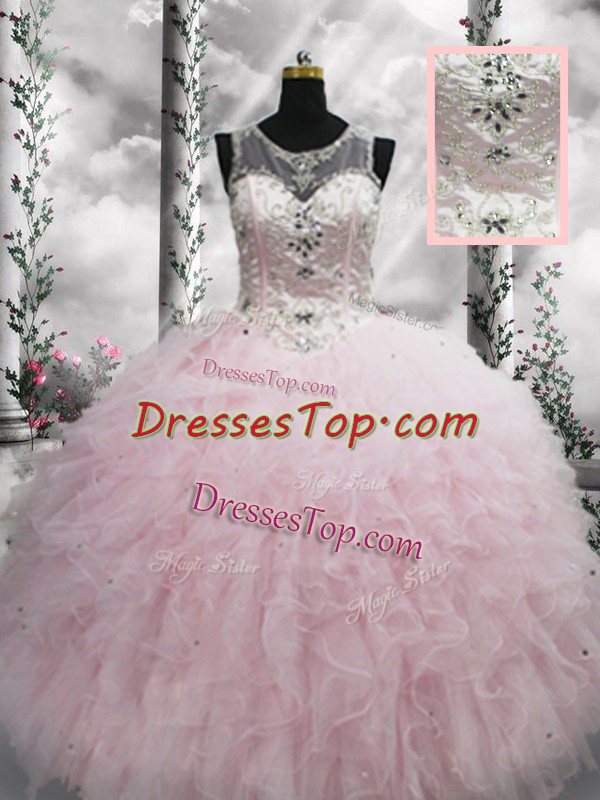 High Quality Floor Length Lace Up Quince Ball Gowns Baby Pink for Military Ball and Sweet 16 and Quinceanera with Beading and Ruffles