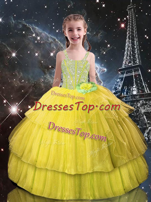 High Quality Floor Length Light Yellow Little Girl Pageant Dress Tulle Sleeveless Beading and Ruffled Layers
