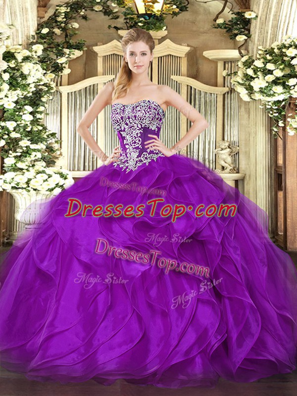 High Quality Floor Length Purple Sweet 16 Quinceanera Dress Strapless Sleeveless Lace Up