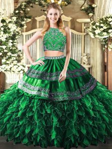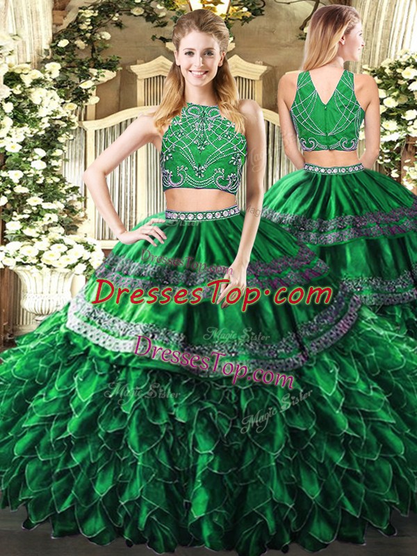 High Quality Floor Length Zipper Quinceanera Gown Dark Green for Military Ball and Sweet 16 and Quinceanera with Beading and Ruffles