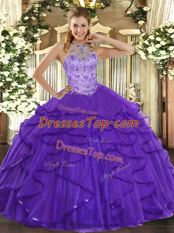 High Quality Purple Ball Gowns Beading and Ruffles Ball Gown Prom Dress Lace Up Organza Sleeveless Floor Length