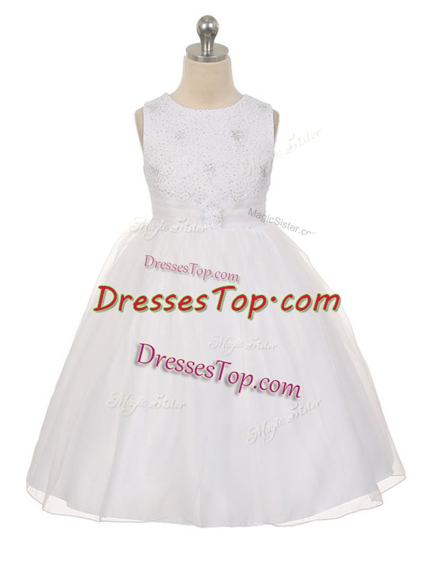 High Quality Scoop Sleeveless Little Girls Pageant Dress Knee Length Beading White Tulle