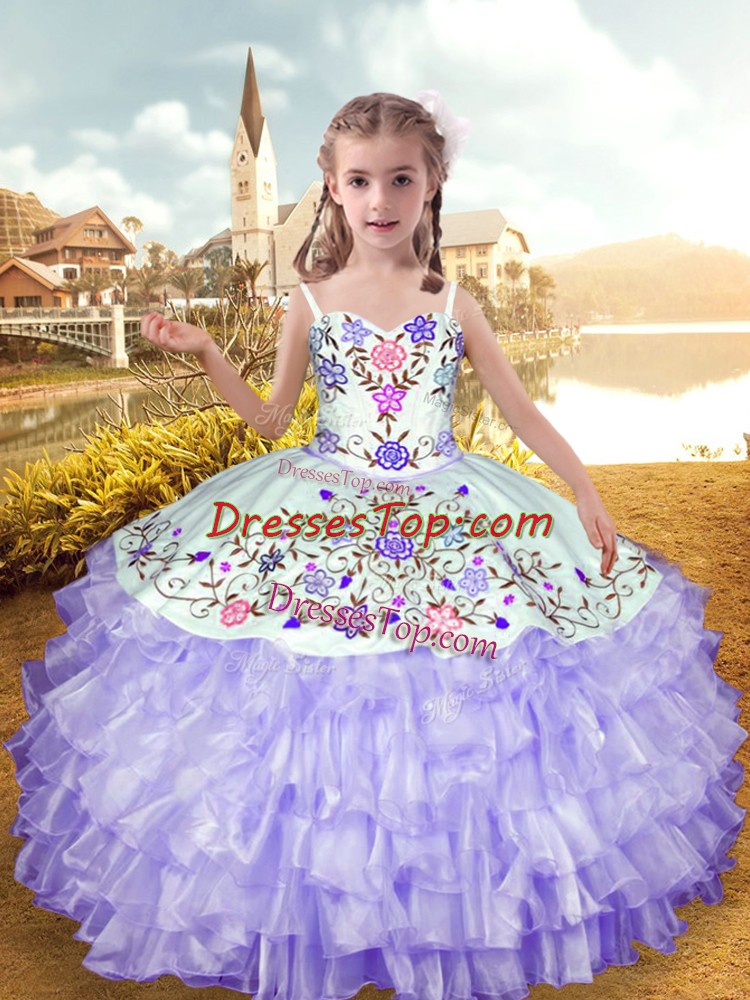 High Quality Sleeveless Organza and Taffeta Floor Length Lace Up Custom Made Pageant Dress in Lavender with Embroidery and Ruffled Layers