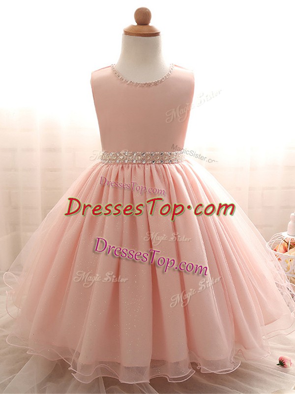 High Quality Sleeveless Organza Floor Length Lace Up Little Girl Pageant Dress in Pink with Beading