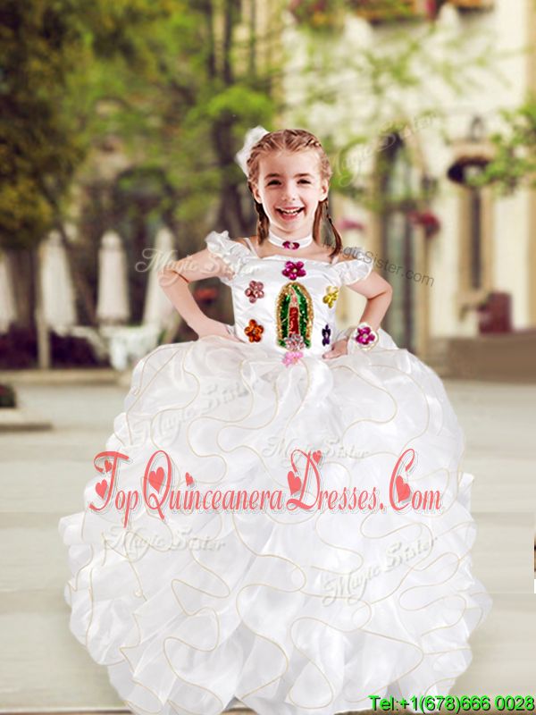 High Quality Spaghetti Straps Cap Sleeves Lace Up Pageant Dress for Girls White Organza and Taffeta