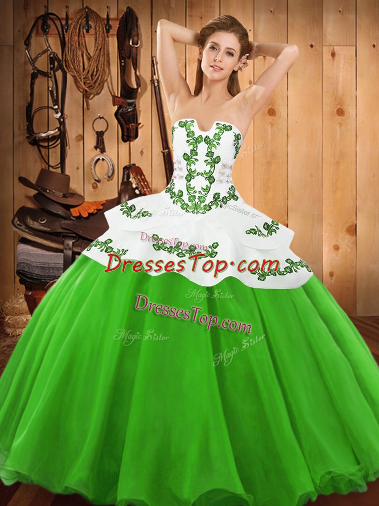 High Quality Strapless Sleeveless Satin and Organza Quinceanera Gown Embroidery Lace Up