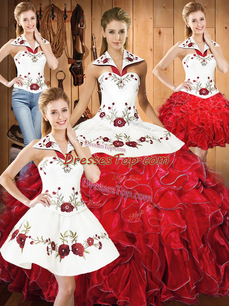 High Quality White And Red Satin and Organza Lace Up Quinceanera Gown Sleeveless Floor Length Embroidery and Ruffles