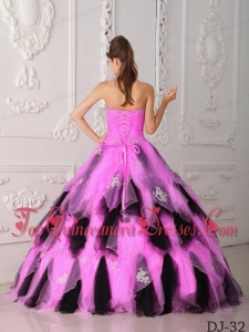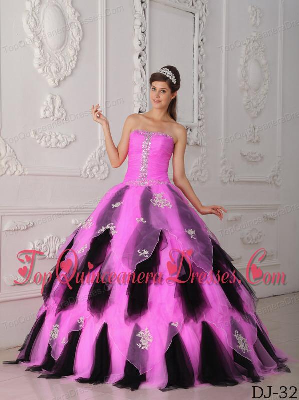 Hot Pink and Black A-Line / Princess Strapless Floor-length Organza Appliques Quinceanera Dress