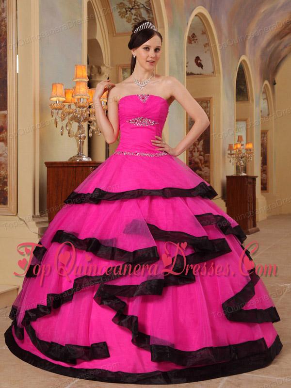 Hot Pink and Black Strapless Floor-length Organza Appliques Unique Quinceanera Dress