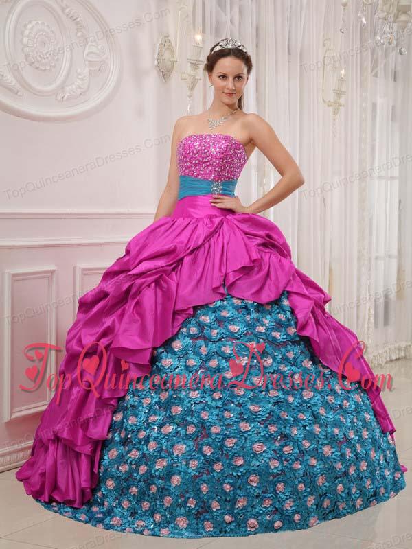 Hot Pink and Blue Ball Gown Strapless Floor-length Taffeta Beading Fashionable Quinceanera Dress