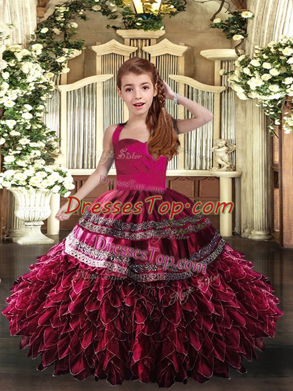Hot Pink and Fuchsia Lace Up Pageant Dress for Teens Appliques and Ruffles Sleeveless Floor Length