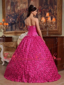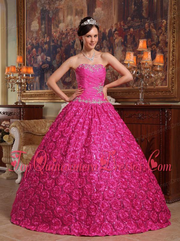 Hot Pink Ball Gown Strapless Floor-length Fabric With Roling Flowers Appliques Quinceanera Dress