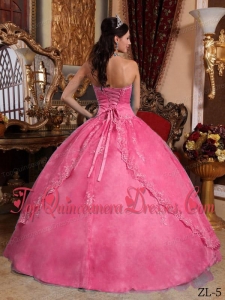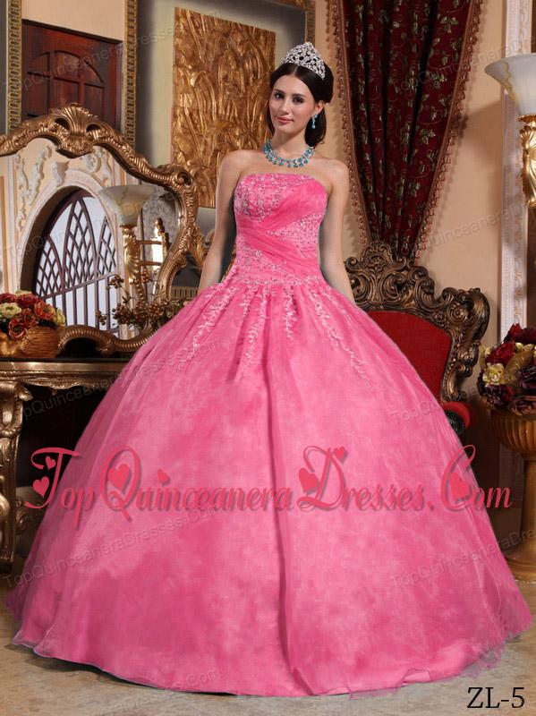 Hot Pink Ball Gown Strapless Floor-length Organza Appliques Cheap Quinceanera Dress