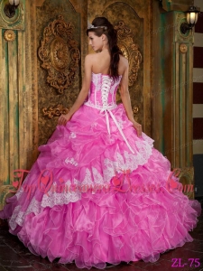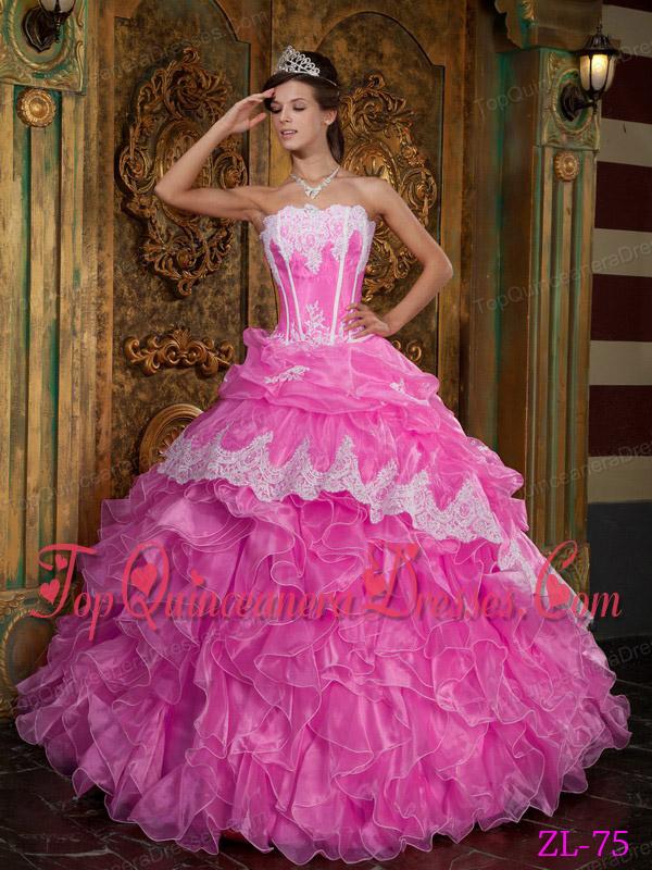 Hot Pink Ball Gown Strapless Floor-length Ruffles Organza Cheap Quinceanera Dress