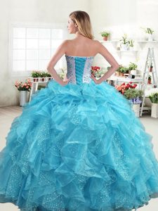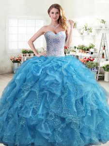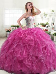 Hot Pink Ball Gowns Organza Sweetheart Sleeveless Beading and Ruffles Floor Length Lace Up Quince Ball Gowns