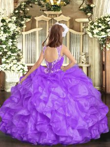 Hot Pink Ball Gowns Organza V-neck Sleeveless Beading and Ruffles Floor Length Lace Up Kids Pageant Dress