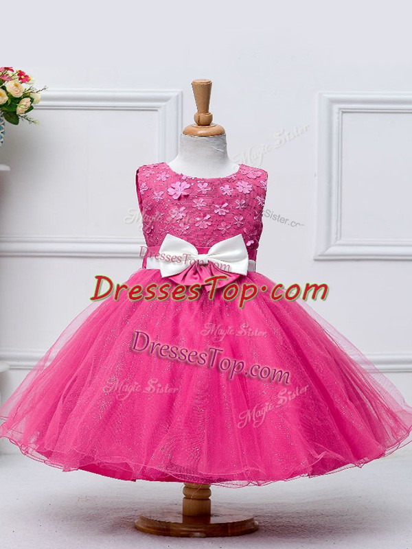 Hot Pink Ball Gowns Tulle Scoop Sleeveless Lace and Bowknot Knee Length Zipper Little Girl Pageant Dress