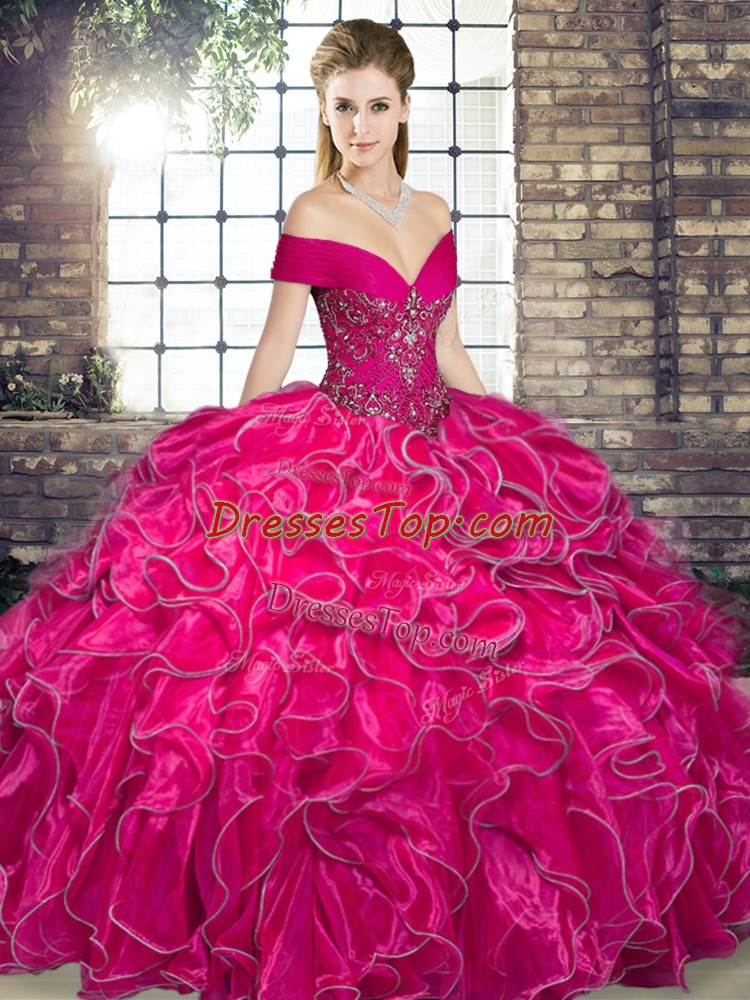 Hot Pink Lace Up Quinceanera Dresses Beading and Ruffles Sleeveless Floor Length