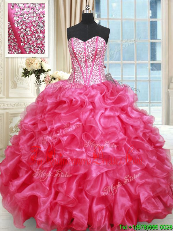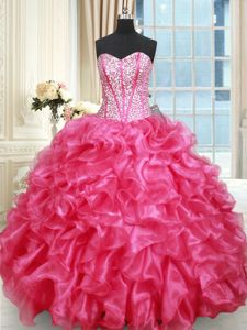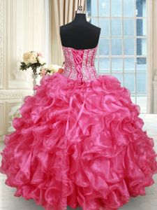 Hot Pink Lace Up Sweetheart Beading and Ruffled Layers Sweet 16 Quinceanera Dress Organza Sleeveless