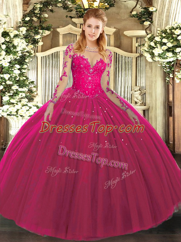 Hot Pink Long Sleeves Tulle Lace Up 15th Birthday Dress for Military Ball and Sweet 16 and Quinceanera